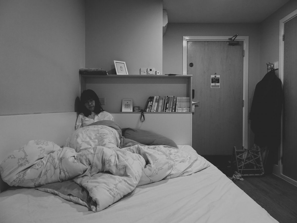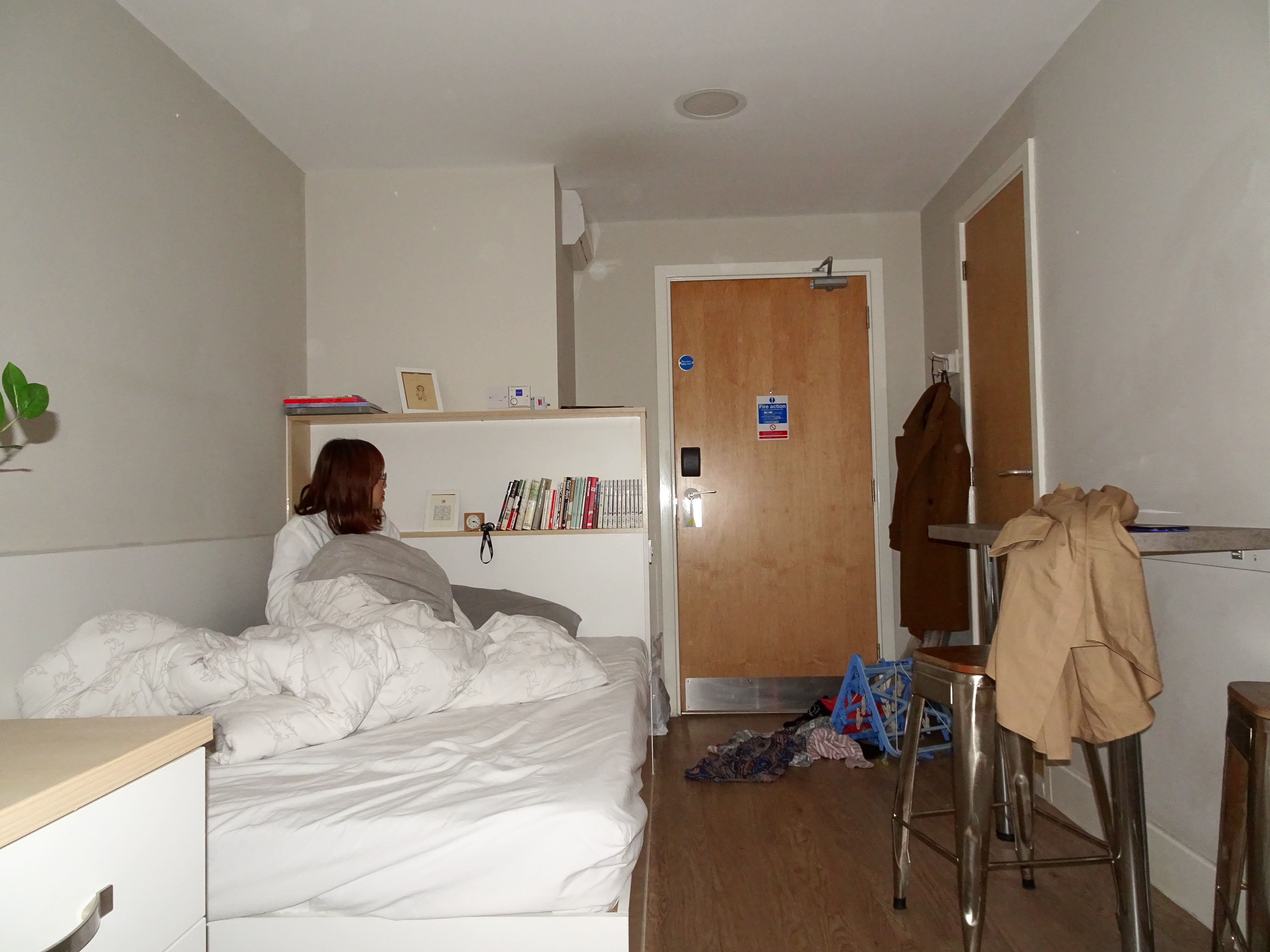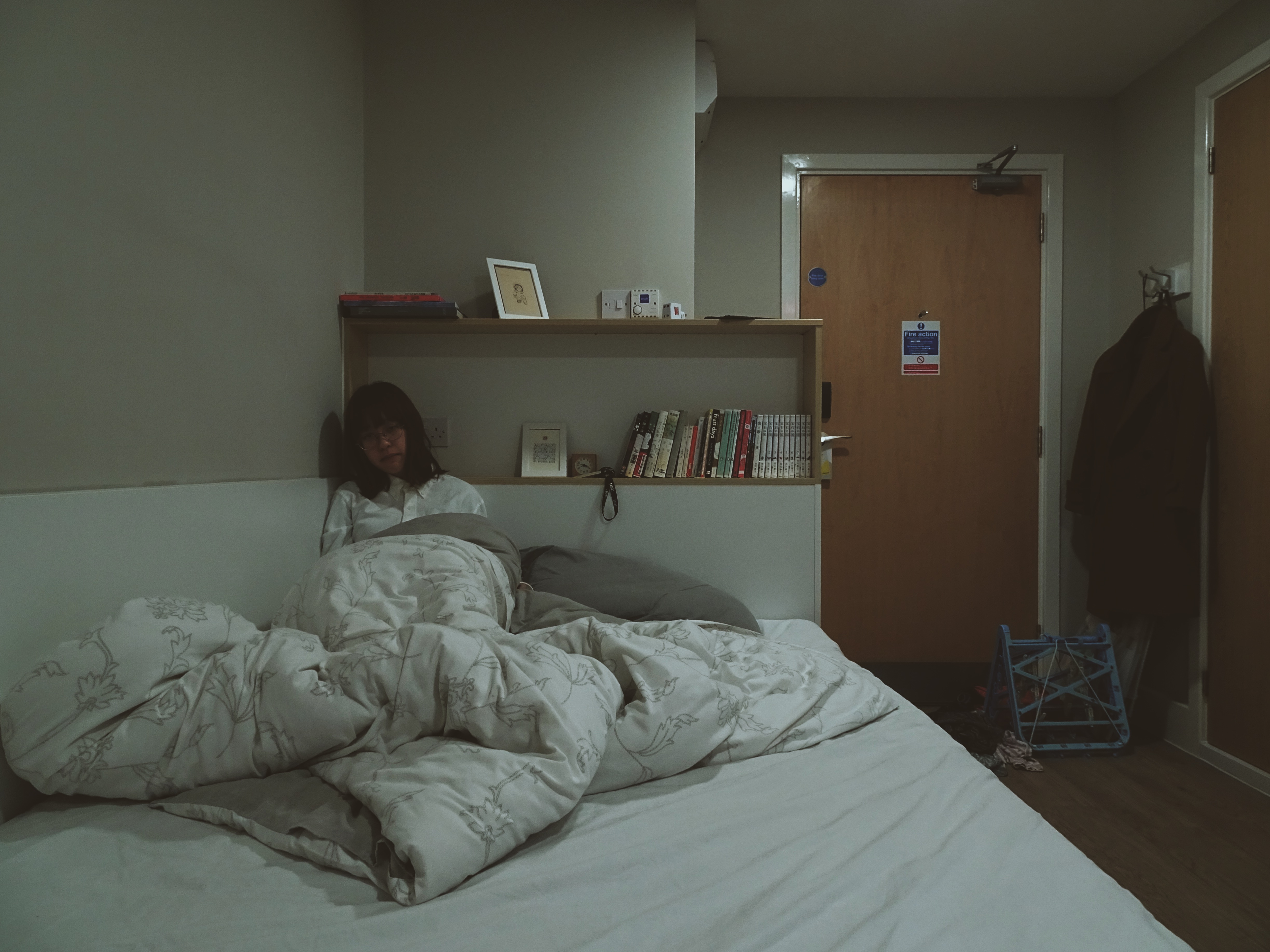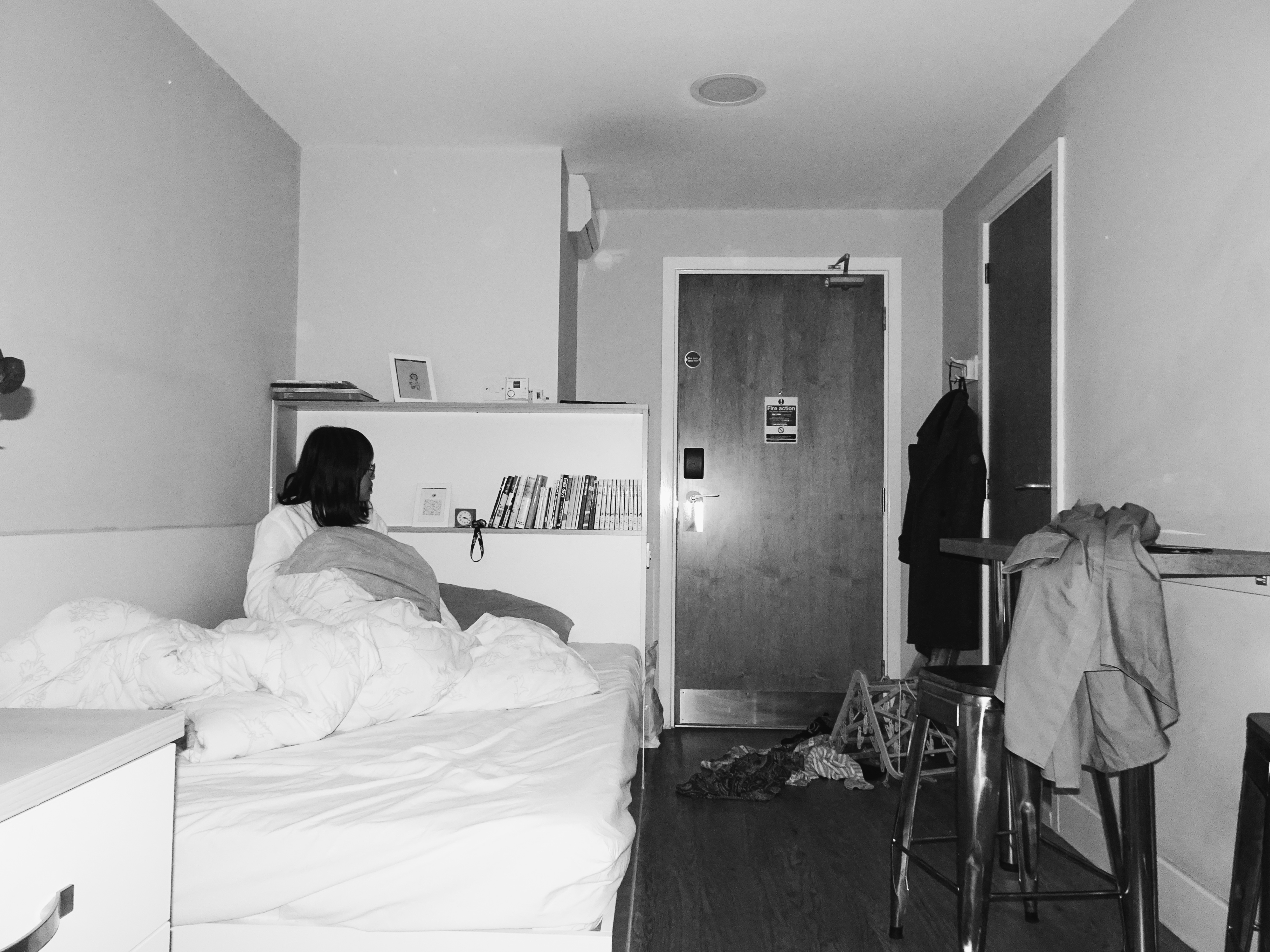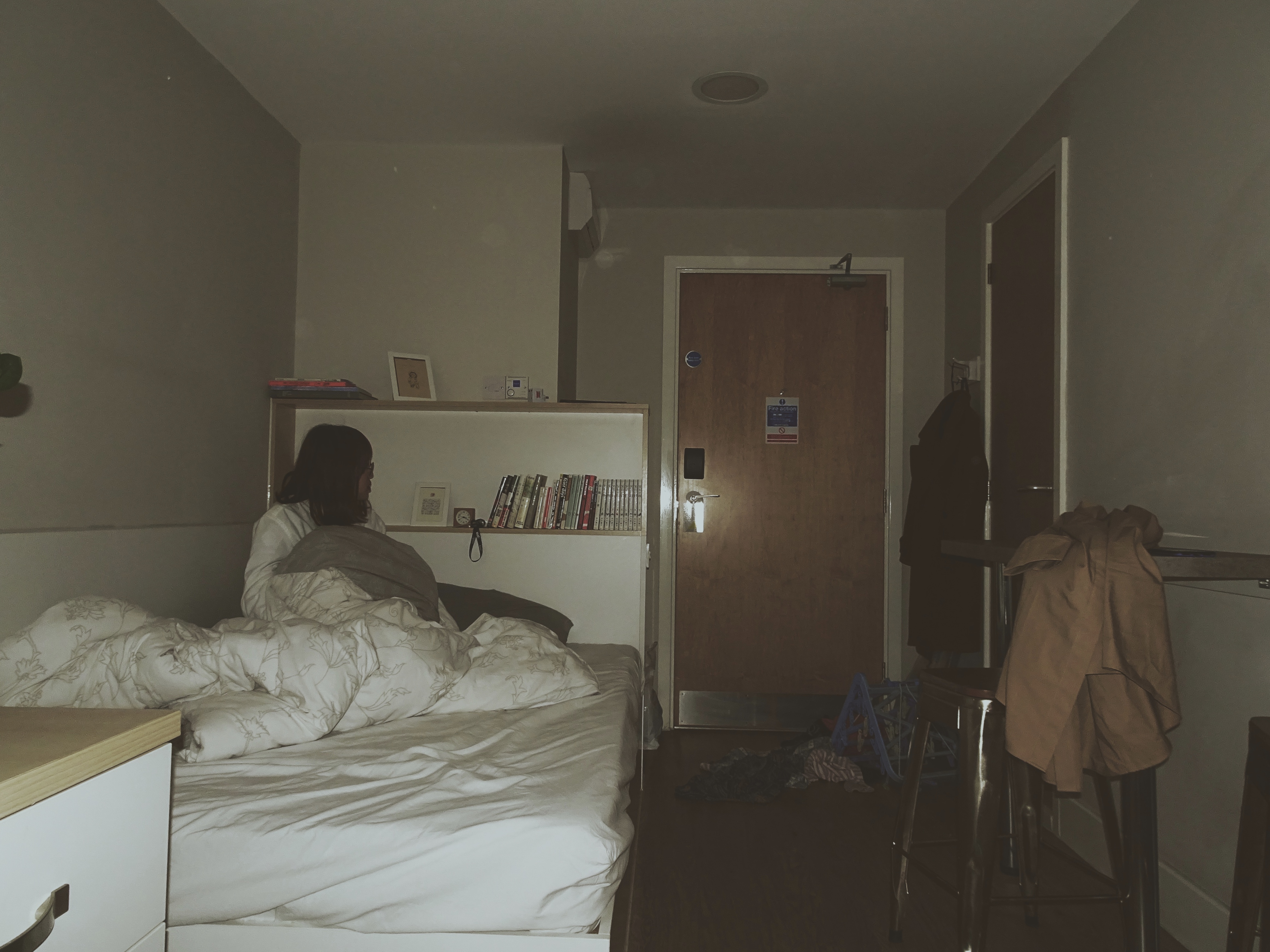 These were staged photos, to test composition and lighting. Unfortunately my room is not very fortunate in terms of lighting, sun rays barely coming through. I decided to halfway shut the curtains for the room pictures and the kitchen. For the kitchen picture, I placed piled up dishes near the sink and the subject feeling guilty for the amount of food she consumed. The room picture: in the bed, as I am often after consumption of a great amount of food, clothes and rack on the floor without being tidied up. The toilet is direct.